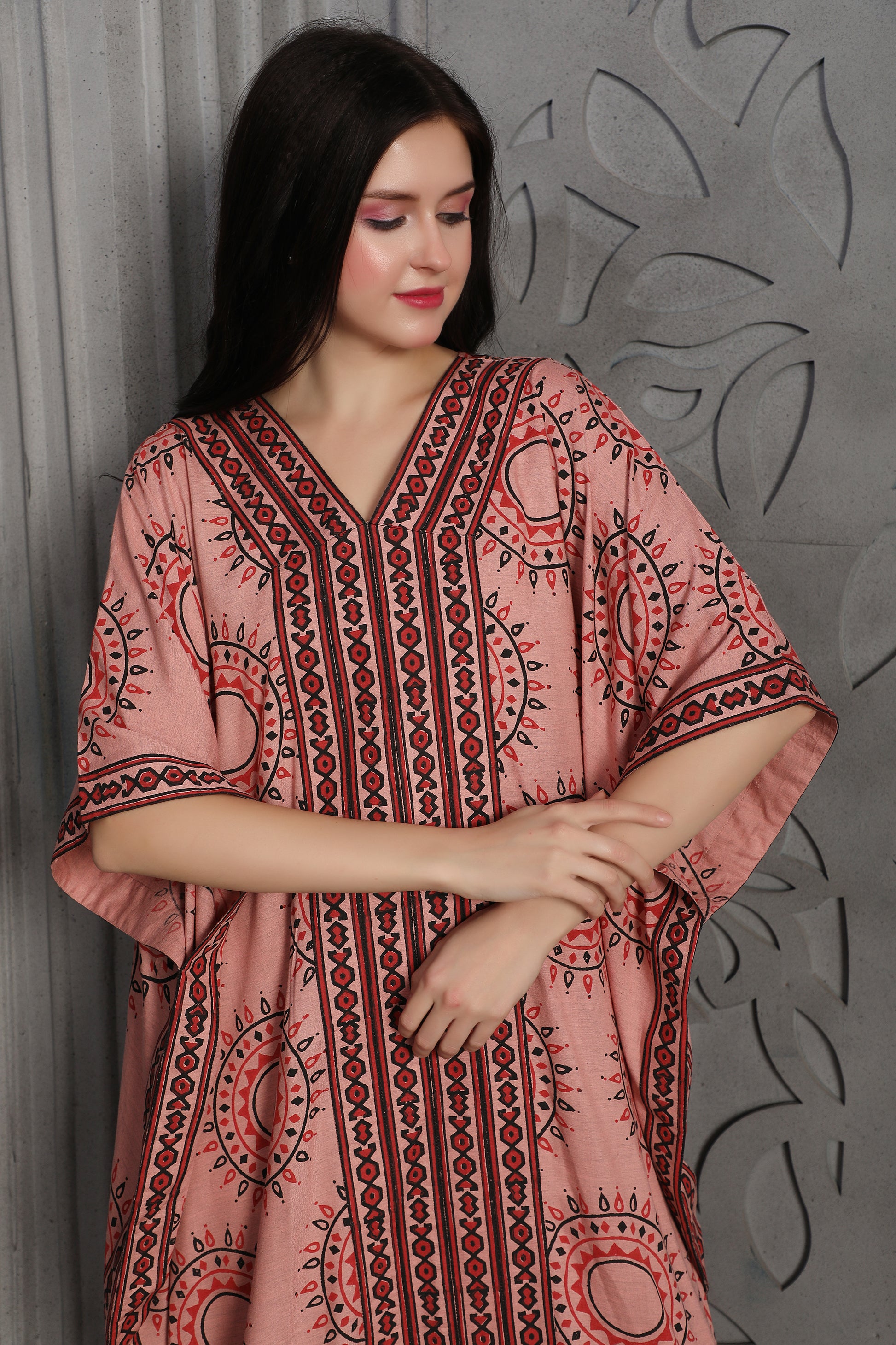 Peach Printed Kaftan Dress with Ethnic Pattern Detailing |
